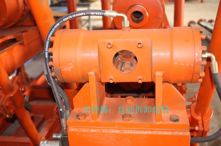 旋轉(zhuǎn)系統(tǒng)、夾緊系統(tǒng)、推進系統(tǒng)全部液壓控制,自動上、卸鉆桿,減輕了操作工人的勞動強度。夾緊卡盤、變速箱系統(tǒng)一體化設(shè)計,夾緊油缸外置,卡緊力大,便于拆裝維修。推進油缸采用雙出頭油缸設(shè)計,具有推進行程長的特點,推進行程可達到880mm。液壓系統(tǒng)采用雙泵供油回路系統(tǒng),推進、旋轉(zhuǎn)互不影響。油泵、馬達、操作閥等核心部件均采用可靠廠家。鉆孔傾角在 ±90°范圍內(nèi)可調(diào),鉆孔300米完全沒問題。