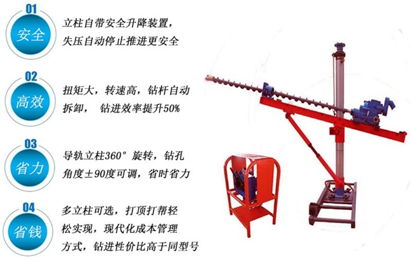 ZQJC-360/7.1型氣動架柱式鉆機產品簡介 類別:氣動架柱式鉆機 型號:ZQJC-360/7.1 品牌:河北啟睿 用途:ZQJC-360/7.1型氣動架柱式鉆機主要用于煤礦煤層探水、探排瓦斯孔或 地質結構孔的施工。相比同類產品,轉速更高,扭矩更大,功率更強、并 可正反轉、大大提高了人機工作效率,使煤礦行業必備鉆具之一。