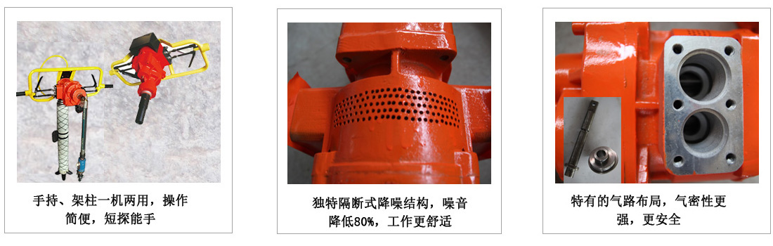 用途:ZQSJ-140/4.1氣動手持式鉆機是靠架柱克服鉆機的重量和工作當中產生的反扭矩。該鉆機為便攜式,它具有安全防爆、轉矩大、帶有反轉、轉速高、質量小、效率高、結構簡單、維修方便等特點。因此本鉆機工作效率高、支護質量好、工人勞動強度低、進尺費用少,所以它是煤礦行業必備設備之一。該機主要用在探測地質構造煤層、探放水、瓦斯、煤層注水、卸放壓力孔,巷道幫錨桿孔的鉆孔及描桿的攪拌和螺母的安裝。也可用于巖巷樹脂錨桿的攪拌及螺母的安裝。